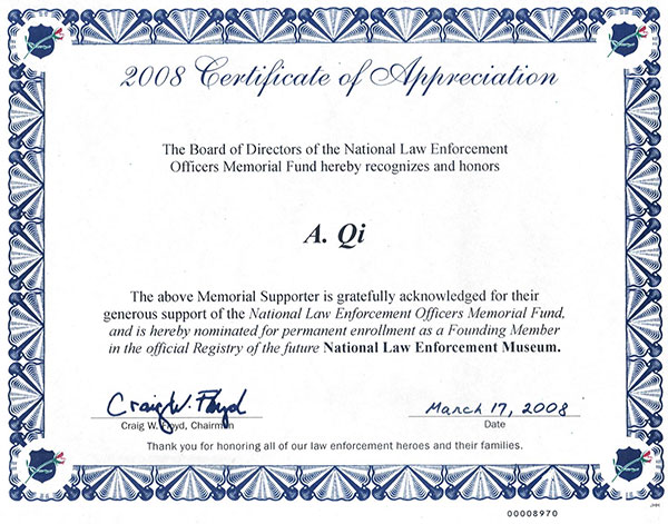 美国国家执法委员纪念基金会给齐爱华教授的嘉奖状