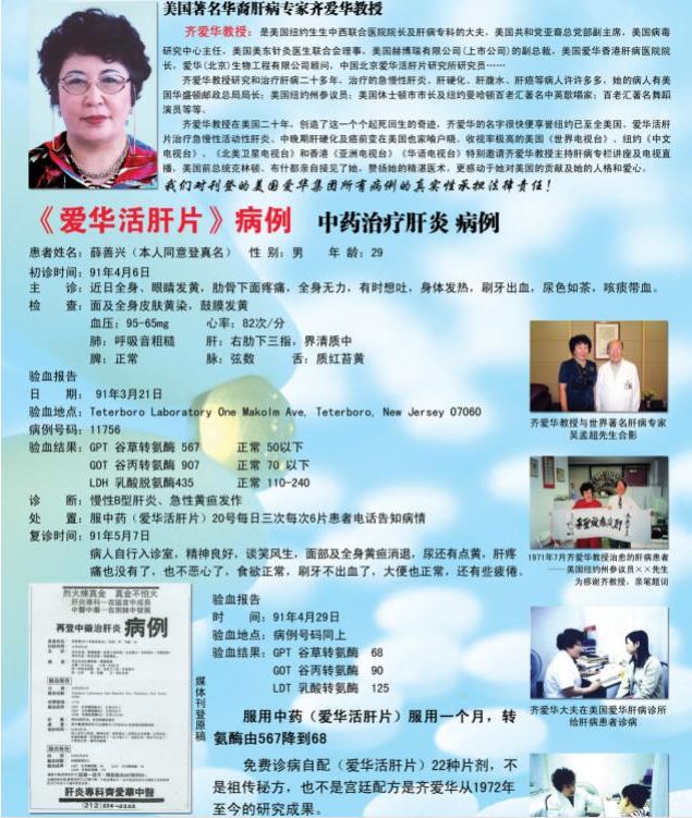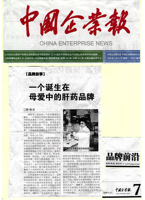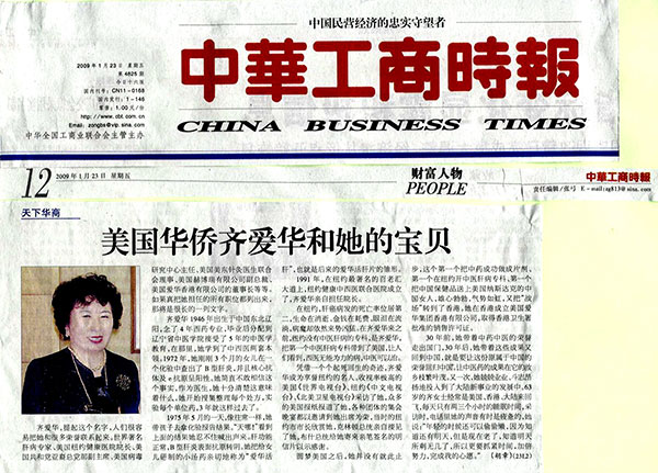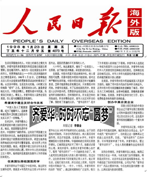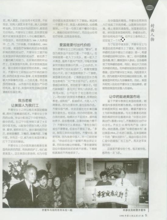 1992年,同样让她难以忘怀。齐爱华在这年中研制出了治疗肝病的新中药,这种药经过美国FDA备案,并经美国普林斯顿大学的毒性试验检测其符合美国药理标准,为她在美国生产中药奠定了依据。她更有信心了!由于出色的医术和良好的医德,她悬壶济世十余载,被周围称许为“行医美国的女杰”。(叶依)