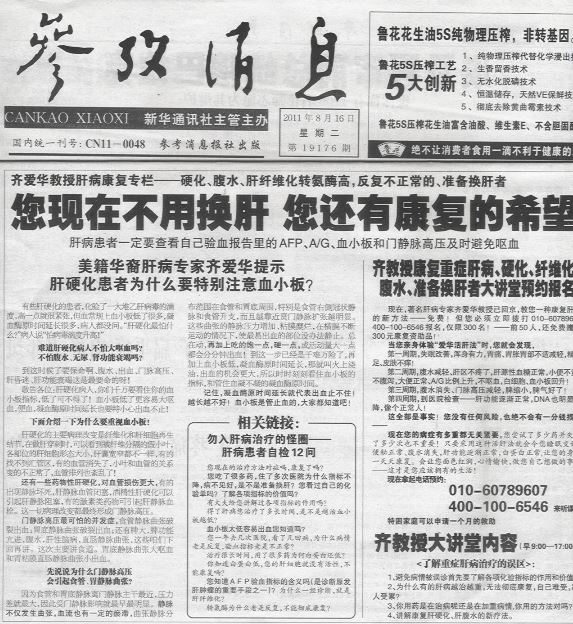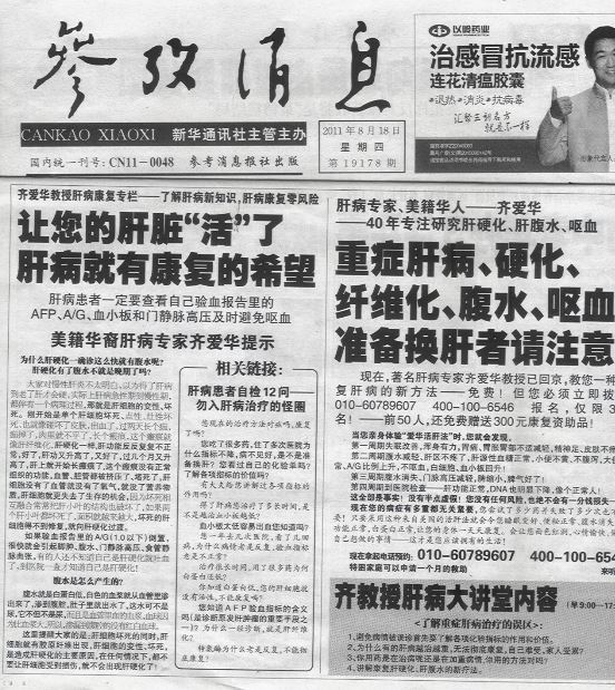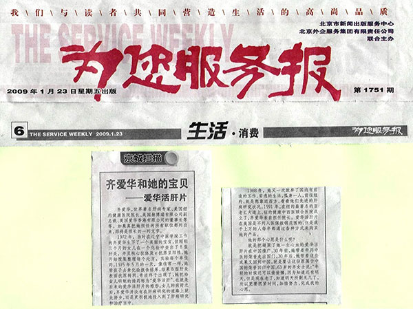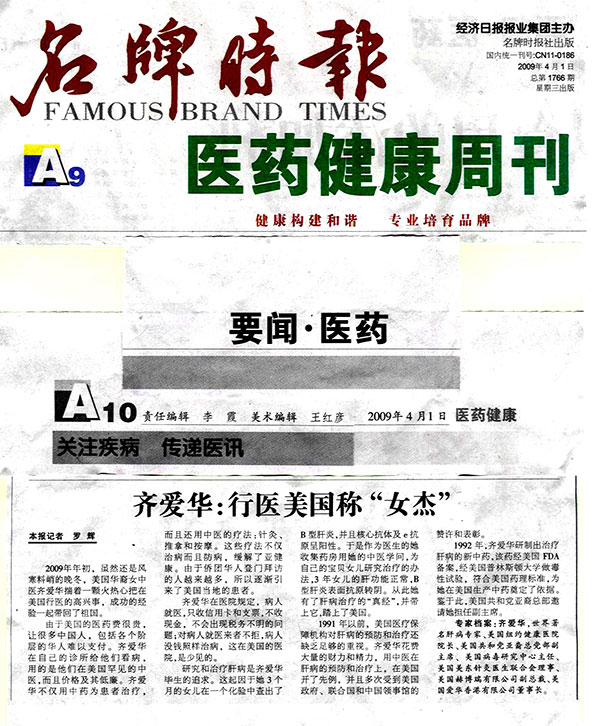 研究和治疗肝病是齐爱华毕生的追求,而1972年她女儿生病的一次经历,更坚定了她一步步攻克难症的决心。那时候,她刚刚3个月的女儿在一次化验中查出了B型肝炎,并且核心抗体及e抗原呈阳性。作为医生,又是母亲,她心急如焚。于是,她开始搜集整理处方,试验每个单位药,用她的中医学问为自己女儿研究治疗的办法。3年就这样过去了。两年后5月的一天,像往常一样,她带孩子去拿化验报告结果。“天啊!”看到上面的结果她忍不住喊出声来——女儿肝功能正常,B型肝炎表面抗原转阴!从此她有了肝病治疗的“真经”,并带上它,勇敢地踏上了美国行医路。