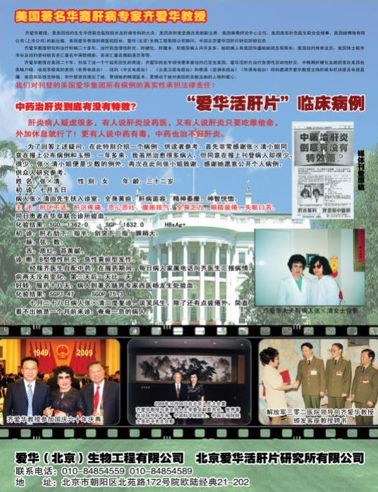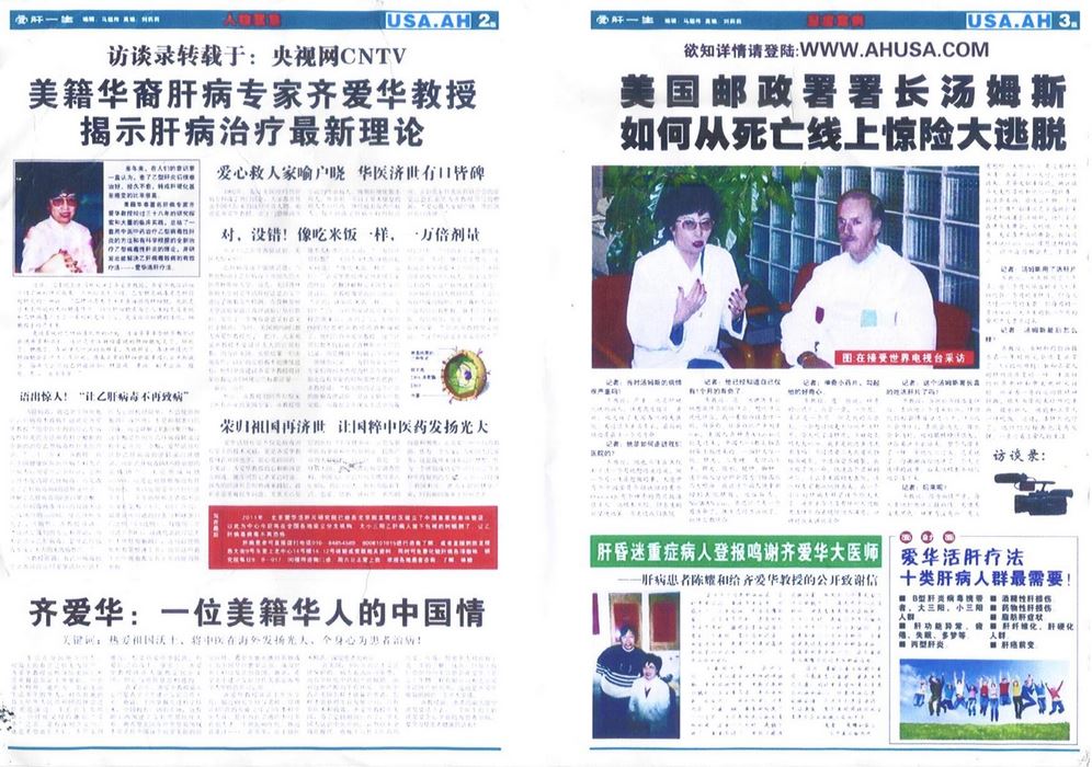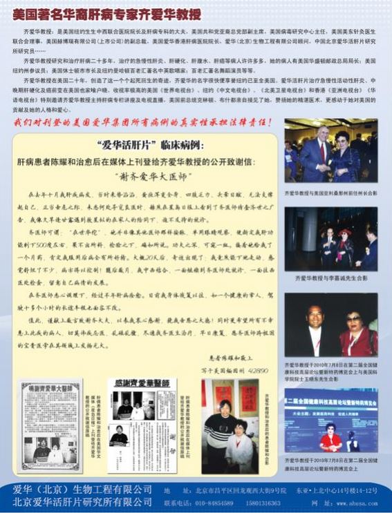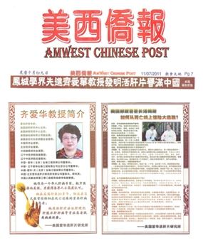 她无疑知道这条路是艰难的。上世纪90年代之前美国医疗保障机构对肝病的预防和治疗还缺乏足够的重视,得到主流认可堪比攀登巨峰,可她憋足了一股劲,她相信有医术、有品行就不怕!“酒香不怕巷子深,”齐爱华花费了大量的精力和财力,把中医用在肝病的预防和治疗上,在美国开了个先例,并且多次受到美国政府有关机构和中国驻纽约领事馆的赞许和表彰。