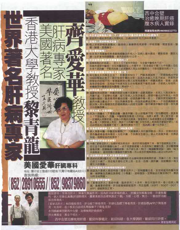 齐:这种晚期的肝癌病人,百分之八十都有并发症,完全靠中医根本不行,我虽然是学中医的,但在西医诊室工作两年半,对急重症不惊,心中有数。但在本港不是西医,不能用西药,必须让病人与主治西医配合,才能恰当救治病人。
